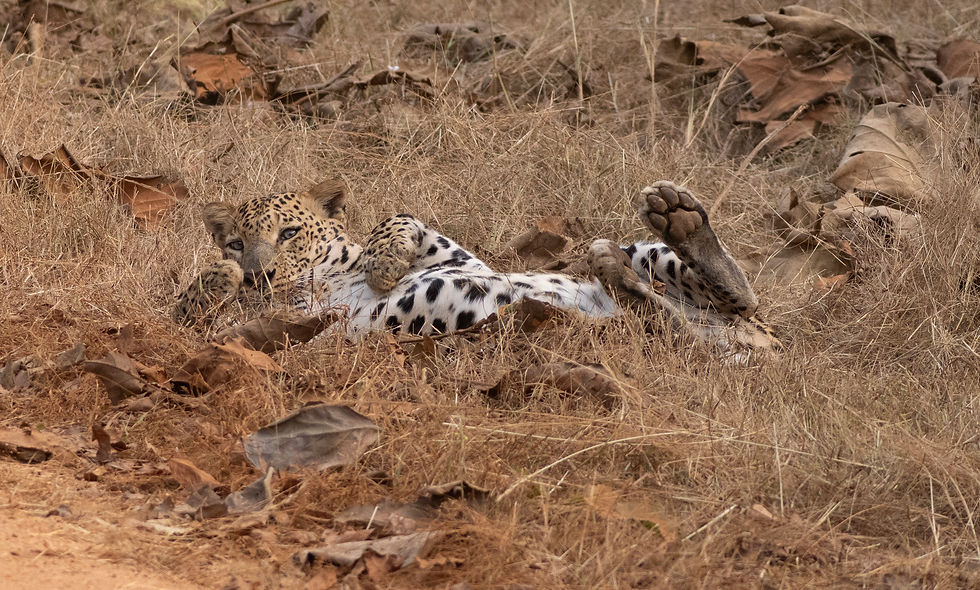 Regaining our composure from the mornings tiger encounters we were again driving the tracks. Down a side track our driver spotted a cat. It was a leopard ! Stood in the middle of the track looking straight towards us and then with a air of complete disinterest it moved to the long grass. A great sighting and I was sure that was it and that was all we would see of this leopard. But no! it walked back to the track, had a lie down in the grass flicking its tail and rolling over in a playful pussy cat mode. After a few minutes it got up and started walking towards, yes towards our jeep.